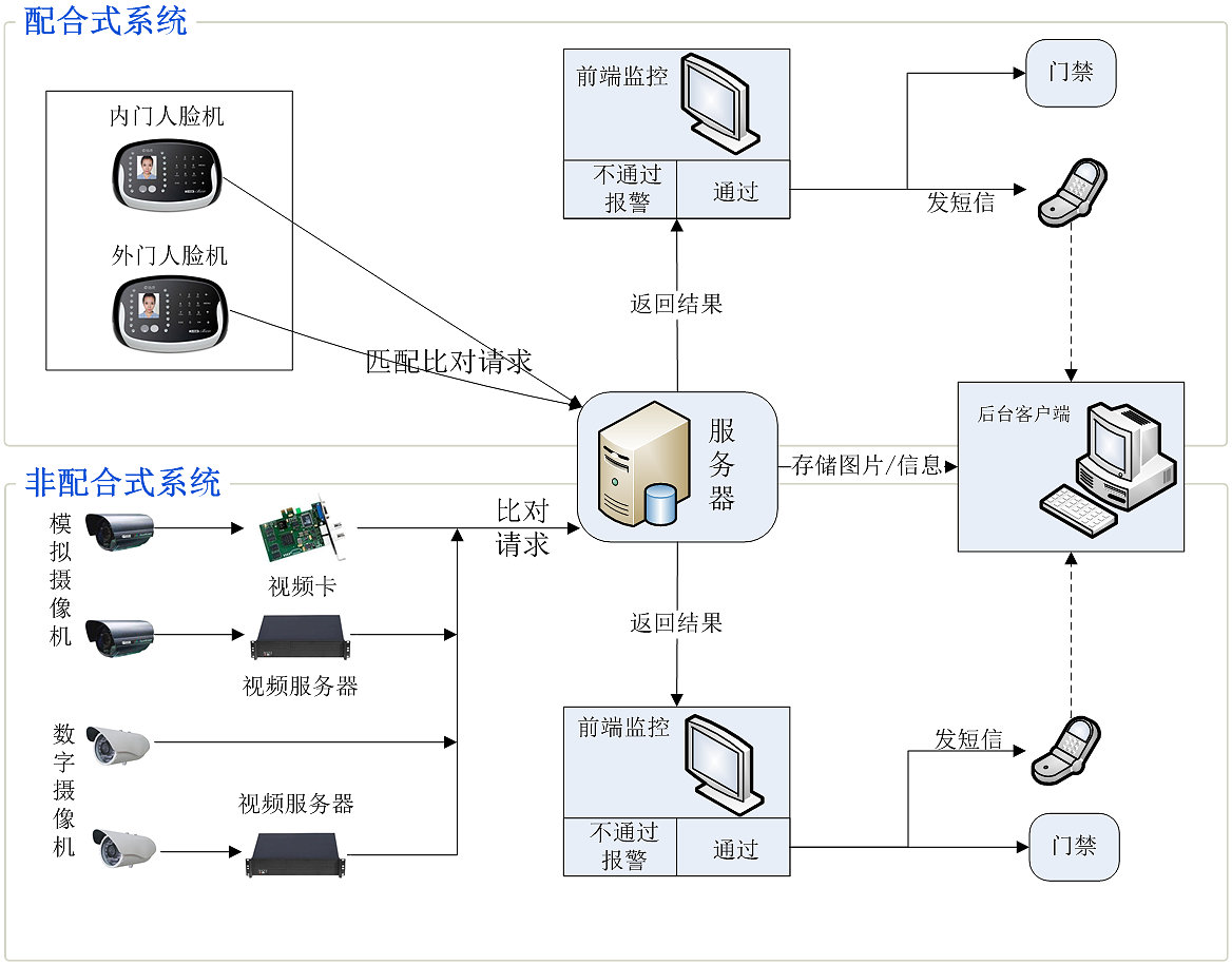 系統(tǒng)特點(diǎn): · 配合式方案采用嵌入式前端識(shí)別機(jī),人機(jī)界面簡單,友好易用,非接觸更衛(wèi)生,避免疾病交叉感染; · 非配合式方案攝像機(jī)安裝數(shù)量少,攝像機(jī)僅對(duì)出入口拍攝,人臉分辨率較為清晰,識(shí)別準(zhǔn)確率提高; · 人臉無法仿冒,采用活體人臉檢測(cè),也杜絕了冒用照片進(jìn)行識(shí)別,絕對(duì)不會(huì)出現(xiàn)冒領(lǐng)的情況發(fā)生,安全性高; · 一旦有不法分子通過不合格途徑冒領(lǐng)孩子,終端將觸發(fā)報(bào)警信號(hào)和拍照信號(hào)(拍下不法分子照片); · 系統(tǒng)采用聯(lián)網(wǎng)形式,通過短信模式實(shí)時(shí)通知家屬孩子接送情況; · 每個(gè)家長僅在進(jìn)出區(qū)域時(shí)識(shí)別一次,服務(wù)器的壓力低; · 非配合式方案還支持脫機(jī)驗(yàn)證,在網(wǎng)絡(luò)堵塞,網(wǎng)絡(luò)故障等情況下均可保證接送順利進(jìn)行。 系統(tǒng)架構(gòu)圖: